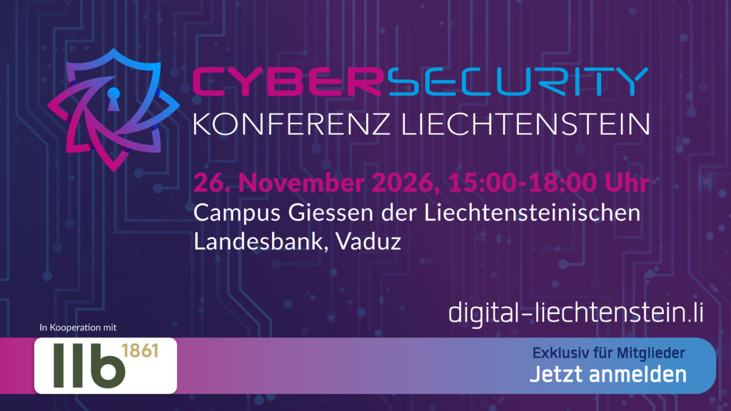 Am Donnerstag, 26. November 2026, veranstalten wir in Kooperation mit unserem Mitgliedsunternehmen Liechtensteinische Landesbank AG (LLB) die vierte Cybersecurity-Konferenz von digital-liechtenstein.li. Wir freuen uns, unsere Mitgliedsunternehmen zu einem hochkarätigen Austausch mit führenden Köpfen aus Wirtschaft, Wissenschaft und Politik einzuladen. Veranstaltungsort ist das 2026 neu eröffnete Haus Giessen der LLB-Gruppe.