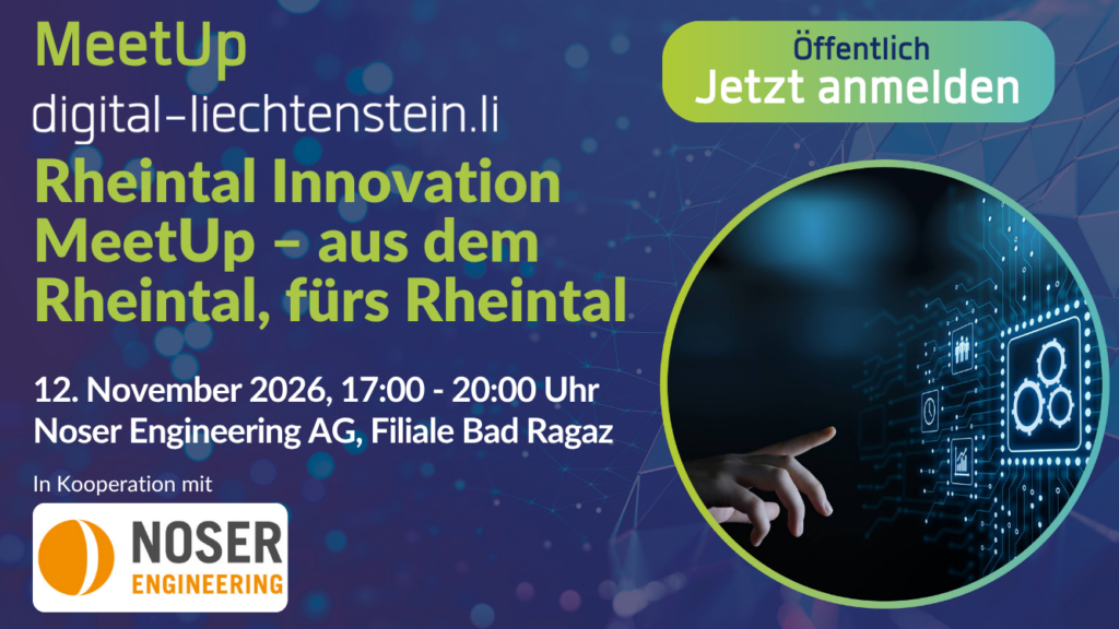 Unter diesem Motto lädt digital-liechtenstein.li gemeinsam mit Noser Engineering AG Entscheidungsträger:innen, Vordenker:innen und Tech-Enthusiasten zum zweiten öffentlichen Rheintal Innovation MeetUp in die Filiale von Noser Engineering nach Bad Ragaz ein. Die Gäste erfahren mehr darüber, wie regionale Hightech-Firmen in Kooperation mit Partnern neue Innovationen entwickeln und auf den Markt bringen. Der Anlass bietet spannende Einblicke, schafft neue Perspektiven und fördert den Austausch mit Innovationsakteur:innen aus der Region. Beim anschliessenden Apéro riche bietet sich die Gelegenheit, Netzwerke zu pflegen und neue Kooperationen anzustossen.