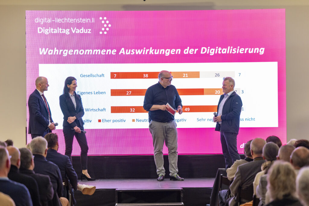 Das Eröffnungsprogramm wurde lanciert durch einen KI-Impuls von Peter Matt, Präsident vom IT Crowd Club Liechtenstein, der unter dem Titel «Von Archimedes bis ChatGPT – Warum wir seit 500 Jahren nach Abkürzungen suchen» neue, und auch überraschende Denkanstösse liefert. Anschliessend vertieften Wirtschaftsminister Hubert Büchel, Dr. Béatrice Hasler von der Universität Liechtenstein und Bruno Winkler, Programmleiter Digitalisierung der Gemeinden FL die konkreten Auswirkungen des digitalen Wandels auf Wirtschaft, Verwaltung und Gesellschaft und griffen dabei die Ergebnisse der Bevölkerungsumfrage 2024 zur Digitalisierung in Liechtenstein auf.